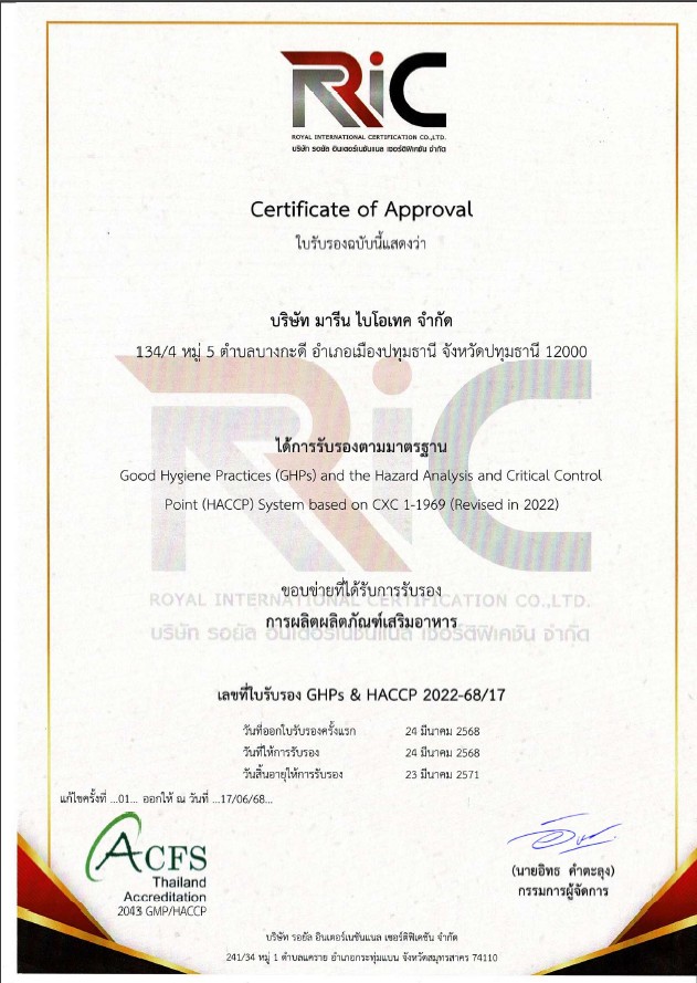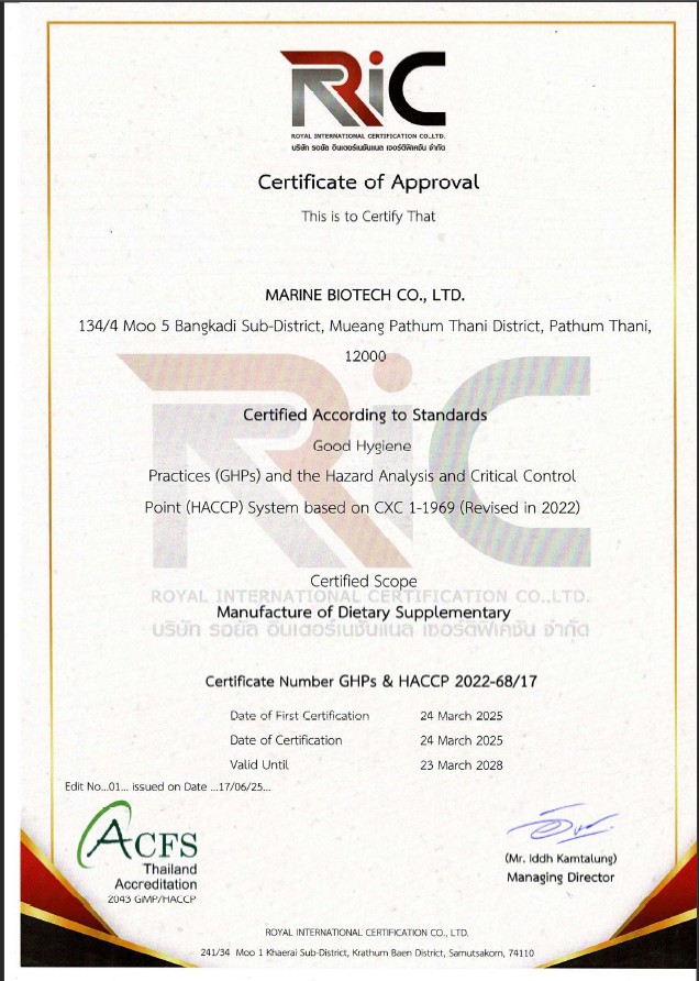 บริษัท มารีน ไบโอเทค ให้บริการแบบครบวงจรสำหรับการผลิตแบรนด์ส่วนตัว (OEM) โดยได้รับความไว้วางใจจากลูกค้าด้วยประสบการณ์อันยาวนานในอุตสาหกรรมอาหารเสริมเพื่อสุขภาพ เรามุ่งมั่นในการพัฒนาผลิตภัณฑ์ที่มีคุณภาพสูงและปลอดภัย ภายใต้มาตรฐานระดับสากล อาทิ FDA, GMP, GHP, HACCPs และอื่นๆ เพื่อให้ลูกค้ามั่นใจในคุณภาพ ความโปร่งใส และความปลอดภัยของผลิตภัณฑ์ทุกชิ้น